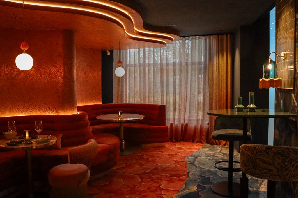 In Deep Sea komt textiel op meerdere plekken samen. De raamtoepassingen, de gordijnen in de ruimte en de bekleding van de kroonluchter zijn uitgevoerd als één geheel.